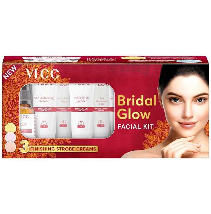 VLCC Bridal Glow Facial Kit with 50gm Content with Hyaluronic Acid, Niacinamide and Vitamin C ihelps promote luminous brightness and a healthy, radiant glow. Specially curated to give you the glow on your special days, this kit comes with an illuminating serum and 3 shades of Finishing Strobe Creams to highlight your radiance. Now choose your glow with Golden Tint Illuminator, Rose Tint Illuminator or Lilac Tint Illuminator to enhance your complexion and glow. Infused with the goodness of Niacinamide to even out skin texture, Hyaluronic Acid to nourish and hydrate your skin, and Vitamin C to brighten skin tone, the VLCC Bridal Glow Facial Kit helps you enjoy your big day without a worry, in just 6 easy steps.