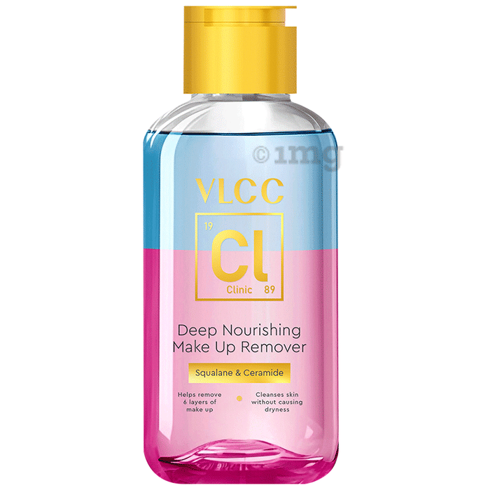 VLCC Clinic Deep Nourishing Make Up Remover is a gentle Bi-phasic system that effectively reduces traces of face and eye makeup. It is designed to remove up to 6 layers of makeup from the skin's surface, it is suitable for all skin types. The Pink micellar water phase enriched with provit B5 reduces sebum and makeup without drying the skin. The Blue nourishing oil phase makeup remover enriched with phytosqualane and triceramide, helps nourish and comfort damaged skin. The unique combination provides not just makeup removal but also helps hydrate skin.