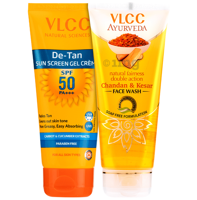 VLCC Combo Pack of De Tan Sun Screen Gel Crème SPF 50 PA+++ (100gm) & Ayurveda Chandan & Kesar Face Wash (100ml) offers comprehensive skincare solutions to protect and rejuvenate your skin.