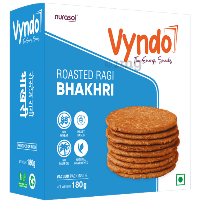 Vyndo Roasted Ragi bhakhri is a ready-to-eat savoury snack made using Ragi flour, Oats, Garlic Paste, and Sesame Seeds. Roasted instead of fried, it offers a light and crunchy texture suitable for children and adults. Ragi may support calcium intake, while oats and sesame may contribute dietary fibre. The inclusion of rice bran oil provides vitamin E. Balanced with chilli paste and rock salt, this flavourful bhakhri can be enjoyed directly from the pack and is a convenient option for tiffins or quick snacking.