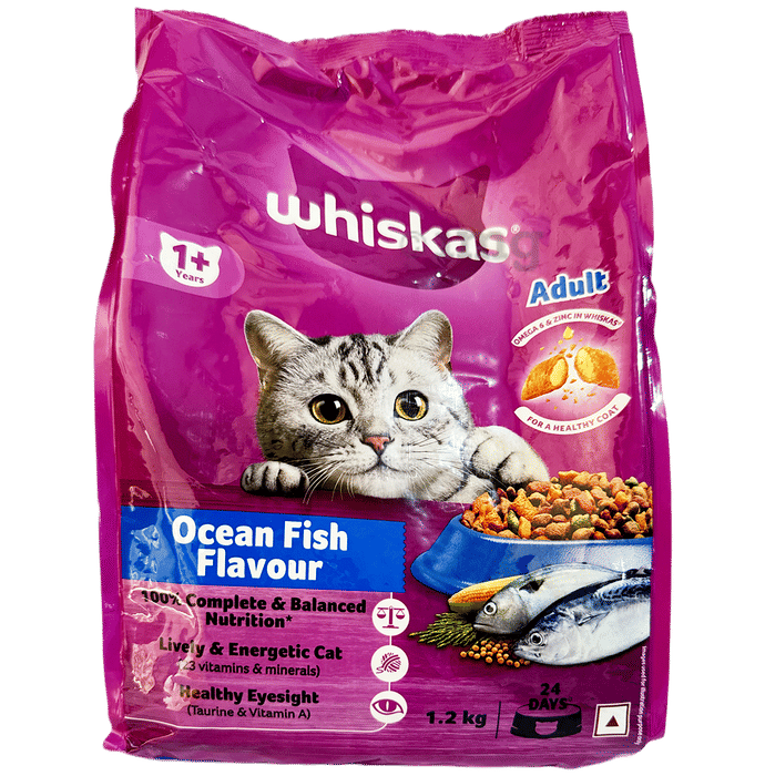 Whiskas Adult 1+ Year Dry Cat Food Ocean Fish Flavour is a healthy and complete meal for your cat, packed with proteins, vitamins and other important nutrients. It is prepared with the delicious flavour of ocean fish and is rich in Omega 3 and 6 fatty acids and zinc to help your cat develop a healthy and shiny coat and enhance his eyesight as well.