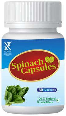 Pharmtech Spinach Capsule Spinach is a rich superfood. It contains vitamins A, C, and K, iron, calcium, folate, magnesium, potassium, thiamine, and phosphorus. This Spinach, a green leafy vegetable has high water and dietary fibre content which keeps weight in control promotes digestion and relieves constipation. It promotes good skin, eyes, and bones. It gives good energy and improves hair texture and strengthens the follicles.