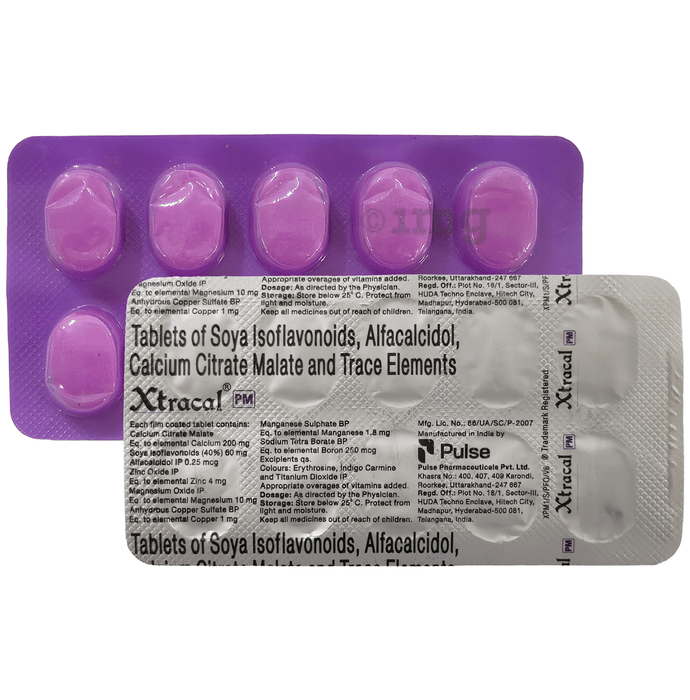 Xtracal PM Tablet is a nutritional supplement which helps in the management of low blood calcium levels in individuals who do not get adequate calcium from the diet. It is used as an adjuvant in conditions affecting the bones, such as osteoporosis (thinning of bones) and fractures. It contains calcium citrate malate, soya isoflavones, alfacalcidol, zinc, magnesium, copper and manganese as active ingredients to improve calcium levels and build strong bones.