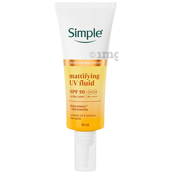 Simple Mattifying UV Fluid Ultra Light Sunscreen Serum SPF 50 PA++++ UVA-UVB is an ultra-light, mattifying sunscreen serum developed by Simple, the Sensitive Skin Expert. This advanced UV fluid provides high-level broad-spectrum protection against UVA and UVB rays while helping control excess oil and shine. The lightweight, fast-absorbing serum texture feels comfortable on the skin and delivers a matte finish without clogging pores. Enriched with Gluta-Amino™ and Niacinamide, the formulation helps reduce the appearance of dark spots, balance oil production, and support the skin barrier. Dermatologically tested and suitable for sensitive skin, this sunscreen serum is PETA-approved vegan, making it ideal for daily sun protection in oily and combination skin types.