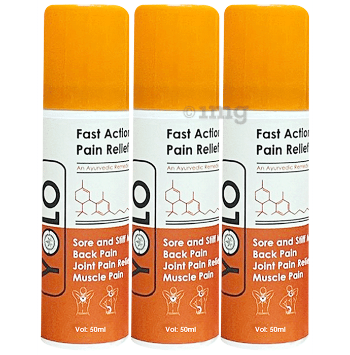 Yolo Fast Action Pain Relief Spray (50 ml Each) is a blend of Ayurvedic ingredients, including Menthol, Eucalyptus Oil, Clove Oil, Turpentine Oil, Vijaya Leaf Extract, and Boswellia. It is designed to help provide soothing comfort for joint and muscle discomfort. Suitable for application on areas such as the neck, knees, shoulders, and other joints, it can offer a convenient option for helping address everyday muscle soreness and stiffness. Simply shake, spray, and allow it to absorb for targeted management.