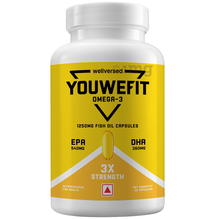 YouWeFit Omega 3 1250 Fish Oil Capsule is a triple strength nutraceutical formulation containing 1250 mg of fish oil derived Omega-3 fatty acids, including 540 mg EPA and 360 mg DHA per capsule. This supplement is developed using fish oil sourced from sardines and anchovies and is processed to maintain purity by being free from heavy metals. Its active content may help support muscle recovery, cardiovascular wellness, joint flexibility, and inflammatory balance during strenuous physical activity. Designed for individuals with active lifestyles, it can contribute to supporting overall well-being when taken as part of a daily routine.