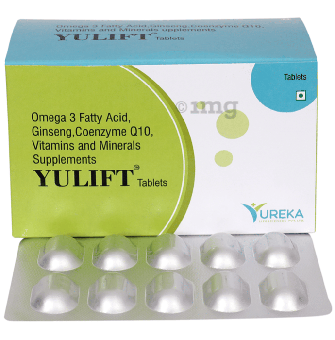 Yulift Tablet is a comprehensive nutritional supplement enriched with Omega-3 Fatty Acids, Ginseng, Coenzyme Q10, Vitamins, and Minerals. These tablets are designed to help promote overall well-being by providing essential nutrients that may assist in supporting immunity, energy levels, and metabolic functions. With a blend of carefully selected ingredients, Yulift Tablets can help maintain vitality and promote physical and mental performance, especially for individuals with demanding lifestyles. This product can be a suitable choice to help support immunity, manage fatigue, and support heart, skin, and overall health.