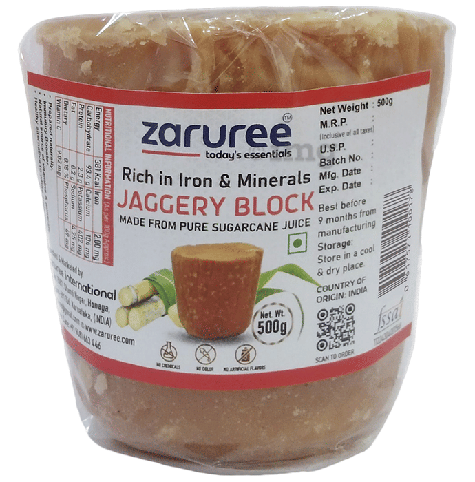 Zaruree Jaggery Block is a naturally processed, chemical-free sweetener made from pure sugarcane juice. It is unrefined to help retain essential nutrients, making it a healthier alternative to refined sugar. This jaggery block is versatile and can be used to make recipes like jaggery tea or coffee, healthy snacks, traditional desserts, breakfast cereal, sambar, rasam, and dal. Its rich nutrient profile can make it a suitable choice for those seeking a natural sweetener with added health benefits.