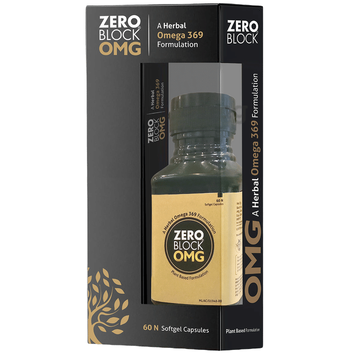 Zero Block Herbal Omega 369 Formulation Softgel Capsule is a medicine formulated with a blend of flaxseed oil, rice bran, punarnava, and safflower. It can help maintain normal cholesterol levels, support cardiovascular health, and assist in immune system management. Being a plant-based source of Omega-3, 6, and 9 fatty acids, the product can help support overall wellness, including bone, joint, skin, brain, liver, and eye health.