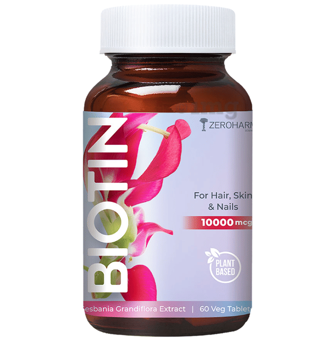 Zeroharm Sciences Biotin 10000 mcg Veg Tablet is rich in biotin, which helps to enhance the health of the hair, skin and nails. It helps to make skin soft, supple and nourished. It is a plant-based product that helps to improve hair growth, thickness and volume. It stimulates keratin production to strengthen the hair and reduce hair fall.
