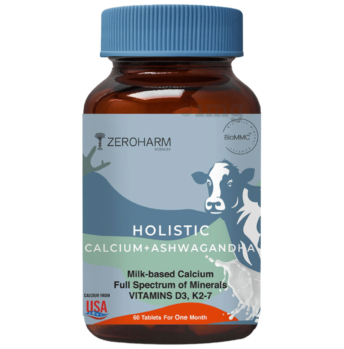 Zeroharm Sciences Holistic Calcium + Ashwagandha Tablet comes with the goodness of milk calcium (milk-based calcium), ashwagandha and a full spectrum of supportive minerals like magnesium and phosphorus along with vitamin d3 and k2 that can offer holistic health benefits like repair of cells and tissues, enhancing bone and muscle health, reducing the risk of osteoporosis, stress-related problems and maintaining body-mind balance. The advanced nano-formulated calcium extracted from milk and nano-formulated ashwagandha, along with minerals and plant-based vitamins, can ensure higher efficacy and therapeutic results even with a much lower dosage.