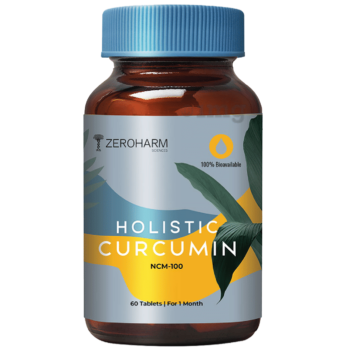 Zeroharm Sciences Holistic Curcumin NCM 100 Tablet is a nutritional supplement containing water-soluble turmeric extracts, including nano-formulated curcuminoids, turmeric, mequinol, peptides, and piperine. It can help improve metabolism and support the immune system. It may aid in improving respiratory health and heart function and reduce the risk of arthritis. Curcuminoids can be beneficial in the treatment of osteoarthritis and rheumatoid arthritis and maintain eye health. The formulation process of this product ensures 100% solubility and bioavailability of the ingredients and offers high efficacy at a lower dosage.