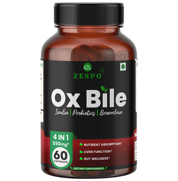 Zespo Ox Bile 550mg Capsule is a 4-in-1 formula that combines Ox Bile Extract, Inulin, Probiotics, and Bromelain to support digestive health, liver function, and overall well-being. Ox Bile may help improve the digestion and absorption of fats, while Inulin and Probiotics support a healthy gut ecosystem. Bromelain, derived from Pineapple, is known for its protein breakdown support, contributing to gut wellness and liver detoxification. This blend is an excellent addition for individuals looking to improve nutrient absorption, improve digestive wellness, and support liver detoxification. With key ingredients known for their roles in promoting digestive health and overall vitality, Zespo Ox Bile Complex is an ideal choice for those looking to enhance nutrient absorption and detoxify the body.
