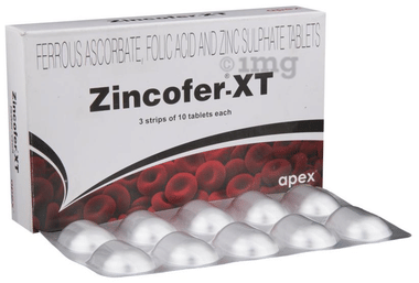 Zincofer Tablet is a dietary supplement with iron, cyanocobalamin, folic acid, vitamin B6, and zinc, which can help produce red blood cells and support immune function. Iron and folic acid aid in red blood cell production which is essential for oxygen transportation from the lungs to the other body parts. Pyridoxine hydrochloride supports brain health and zinc helps boost immune function.