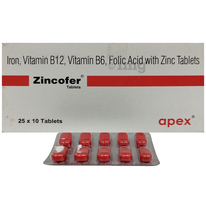 Zincofer Tablet is a dietary supplement with iron, cyanocobalamin, folic acid, vitamin B6, and zinc, which can help produce red blood cells and support immune function. Iron and folic acid aid in red blood cell production which is essential for oxygen transportation from the lungs to the other body parts. Pyridoxine hydrochloride supports brain health and zinc helps boost immune function.